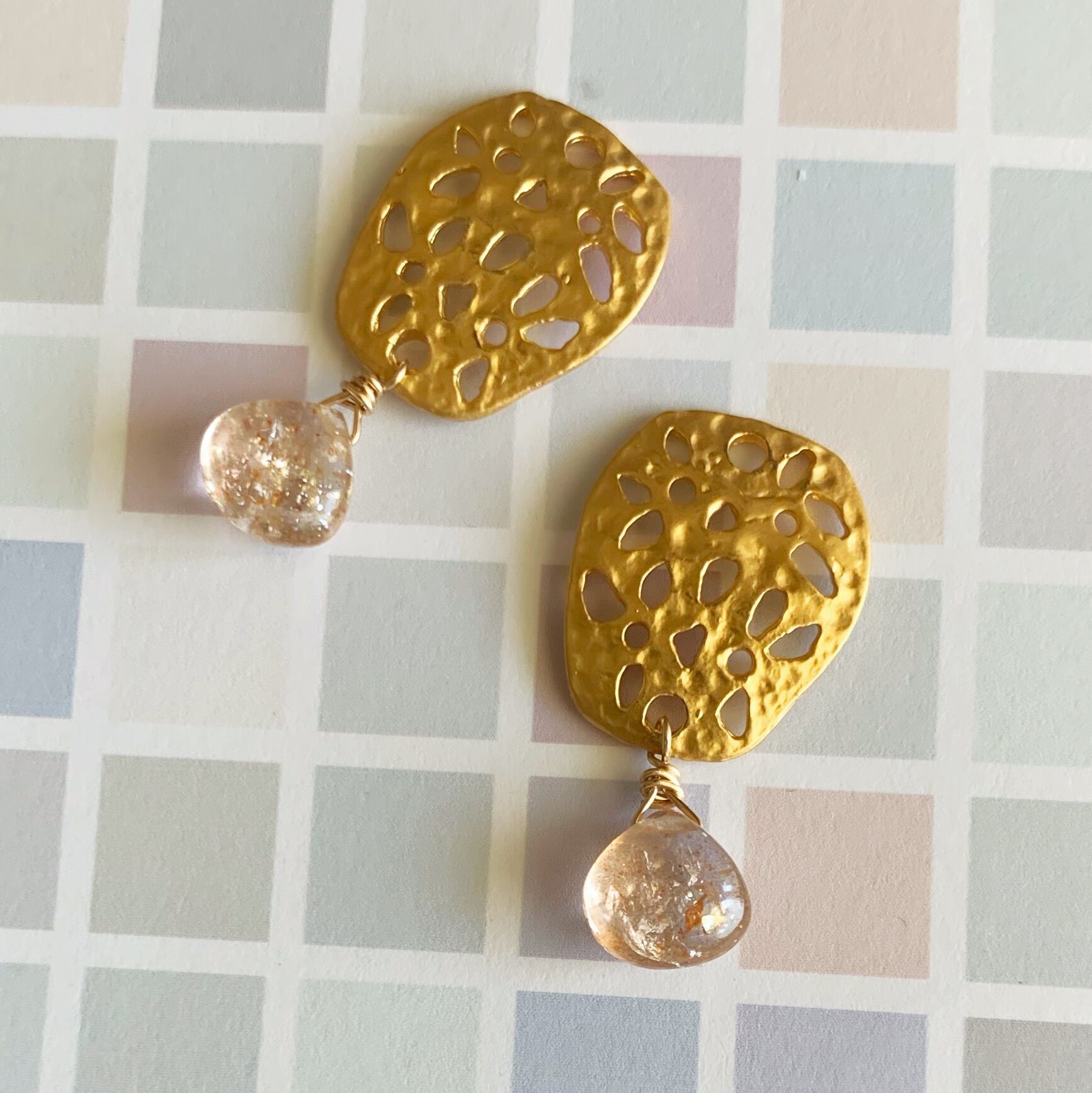 お花の透かしが入ったメタルパーツとオレゴン産サンストーンのチャームです。