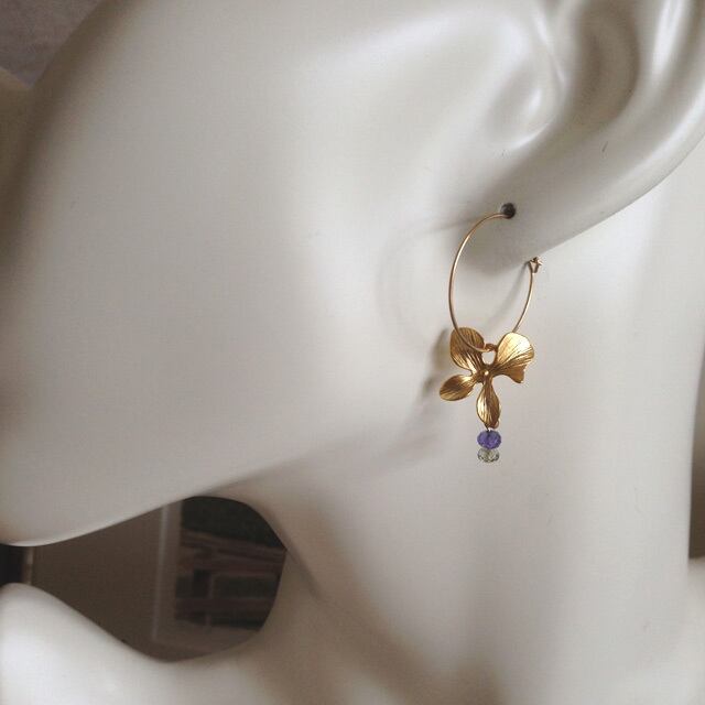 蘭の花のパーツにタンザナイトとモスアクアマリンをつないだピアスチャームです。